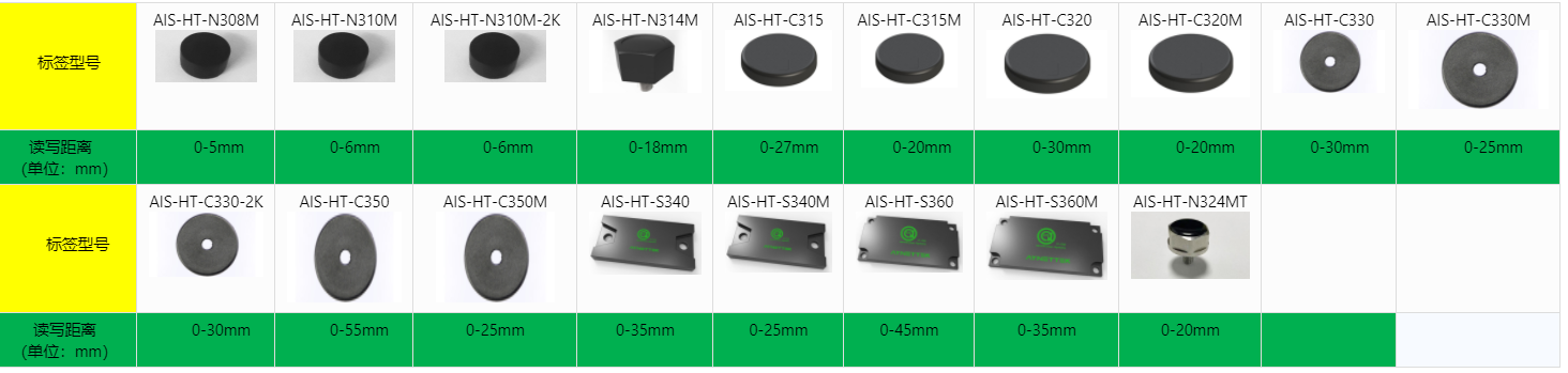 AIS-PHR-Y302W-485读距参考表:(标签后缀带字母:M 为抗金属标签)
